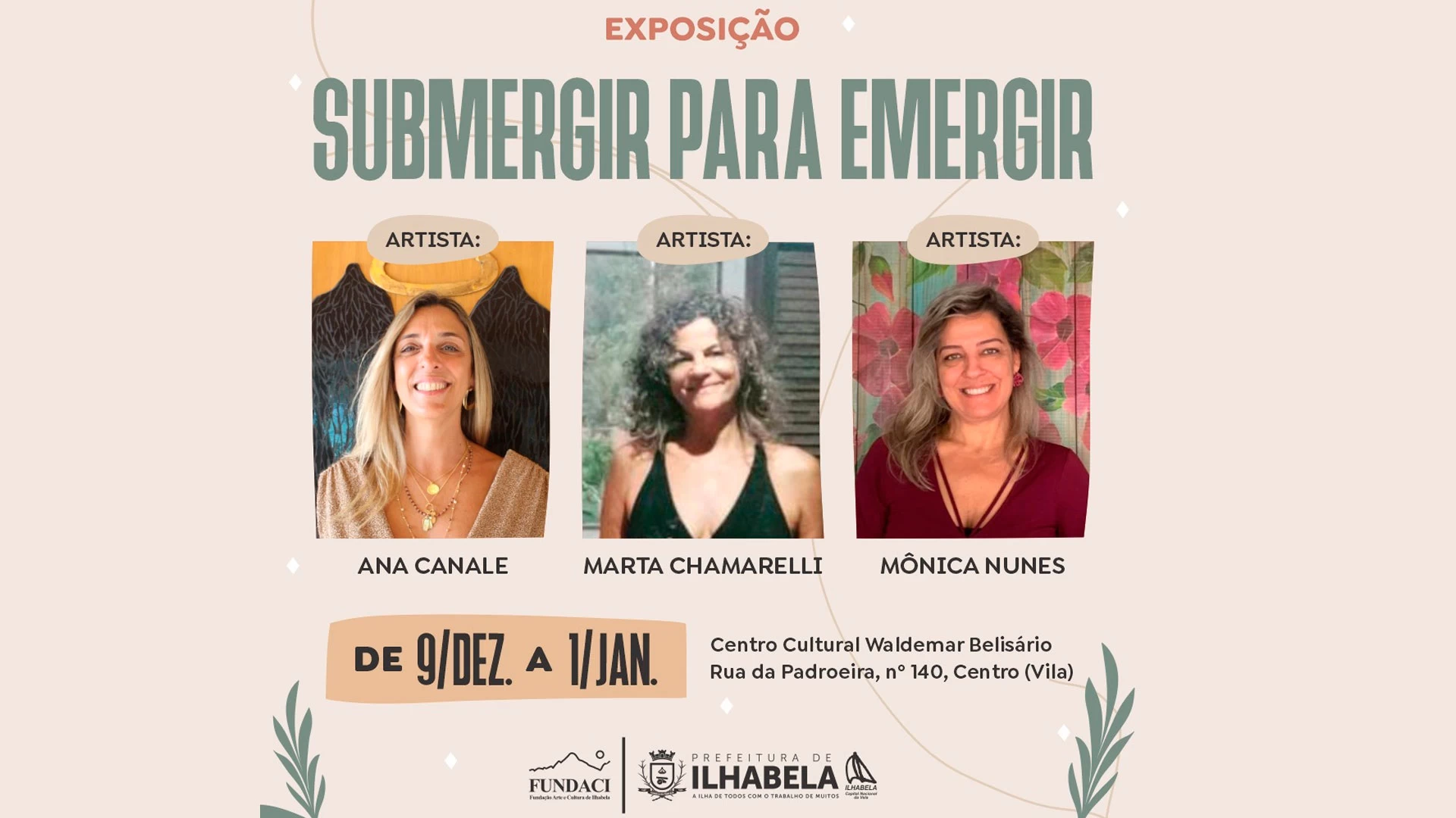 A Prefeitura de Ilhabela abre a exposição “Submergir para emergir”, das artistas Ana Canale, Marta Chamarelli e Mônica Nunes no próximo dia 9 de dezembro no Centro Cultural Waldemar Belisário, localizado na Rua da Padroeira, nº 140, Centro – Vila. A mostra seguirá aberta até o dia 1º de janeiro de 2023.