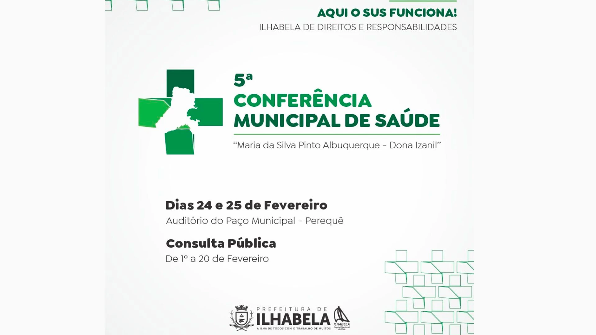 A Prefeitura, por meio da Secretaria Municipal de Saúde, realiza nos dias 24 e 25 de fevereiro a V Conferência Municipal de Saúde de Ilhabela, que neste ano aborda o tema “Aqui o SUS funciona! – Ilhabela de direitos e responsabilidades”. A Conferência será realizada no Paço Municipal e conta como uma etapa da 9ª Conferência Estadual de Saúde e também da 17ª Conferência Nacional de Saúde.