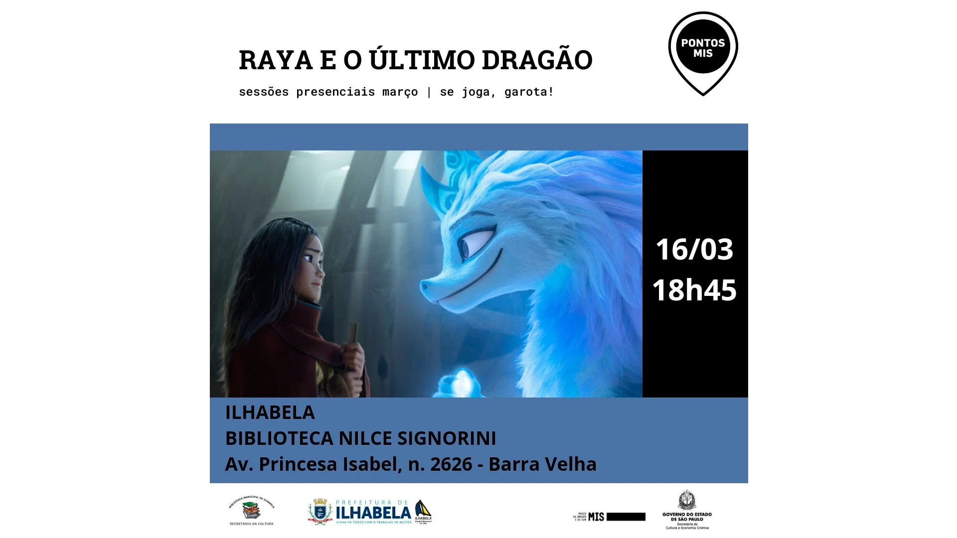 A Biblioteca Municipal da Barra Velha exibirá no dia 16 de março, às 18h45, a animação “Raya e o Último Dragão”. A entrada é gratuita e o filme tem a classificação indicativa de 10 anos.