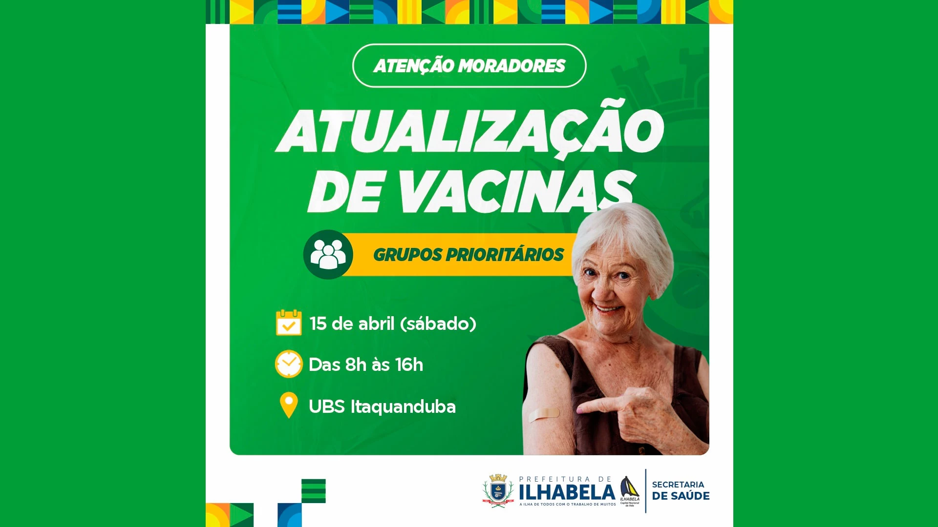Moradores do bairro Itaquanduba em Ilhabela podem atualizar a caderneta de vacinação neste sábado (15) das 8h às 16h na Unidade Básica de Saúde do bairro, localizada na rua Capitão Baltazar M. Gonzales, 104. Além da atualização de todas as vacinas de rotina do calendário estadual também será ofertada vacina contra influenza para grupos prioritários.