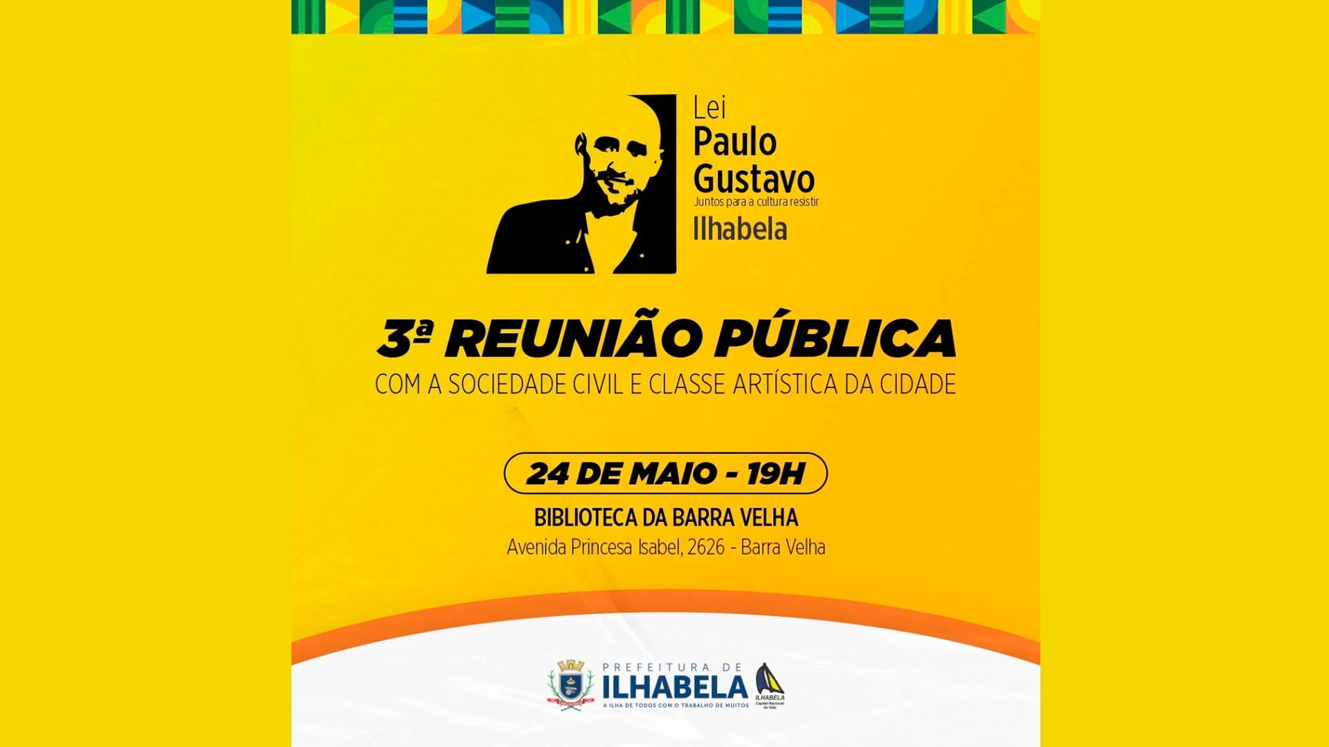 A Prefeitura de Ilhabela realiza no dia 24 de maio a terceira reunião com a sociedade civil e classe artística da cidade para dar continuidade ao processo de difusão e construção das ações de implementação da Lei Paulo Gustavo na cidade.