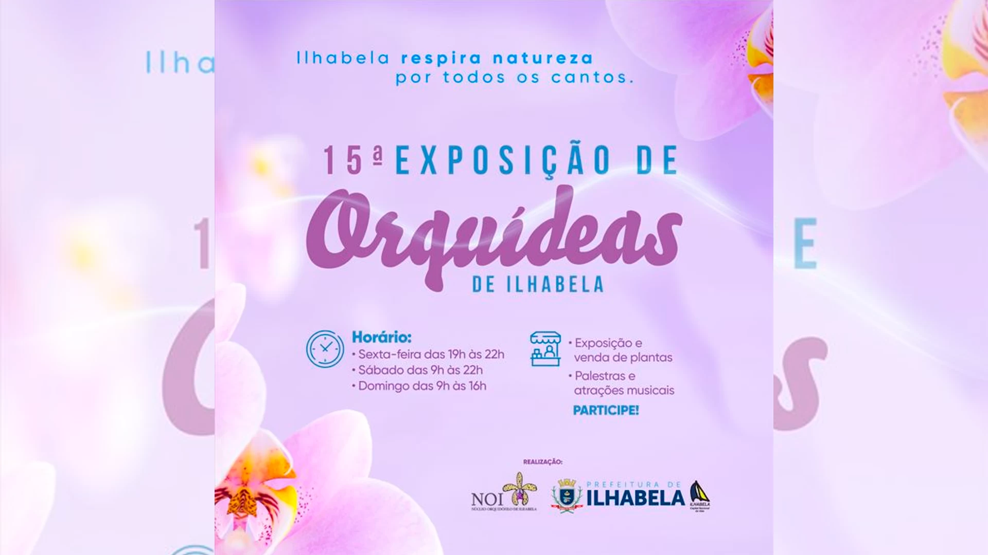 A Prefeitura de Ilhabela promove a 15ª edição da Exposição de Orquídeas entre os dias 12 e 14 de maio na sede da Fundaci, na rua Doutor Carvalho, 80, Vila. A cerimônia de abertura será realizada na sexta-feira (12) às 19h, seguida da exposição de várias espécies de orquídeas e venda de plantas, acessórios e itens relacionados ao cultivo dessas flores.