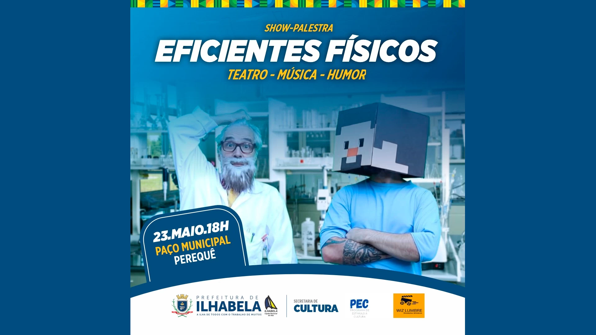 A Prefeitura de Ilhabela, por meio do Programa de Estímulo à Cultura (PEC), realiza no dia 23 de maio, às 18h, uma palestra-show apresentada pelo atleta Lucas Andrade e pelo artista multimídia Vállerio Wiz, no Paço Municipal. A atração faz parte do projeto “Eficientes Físicos”.