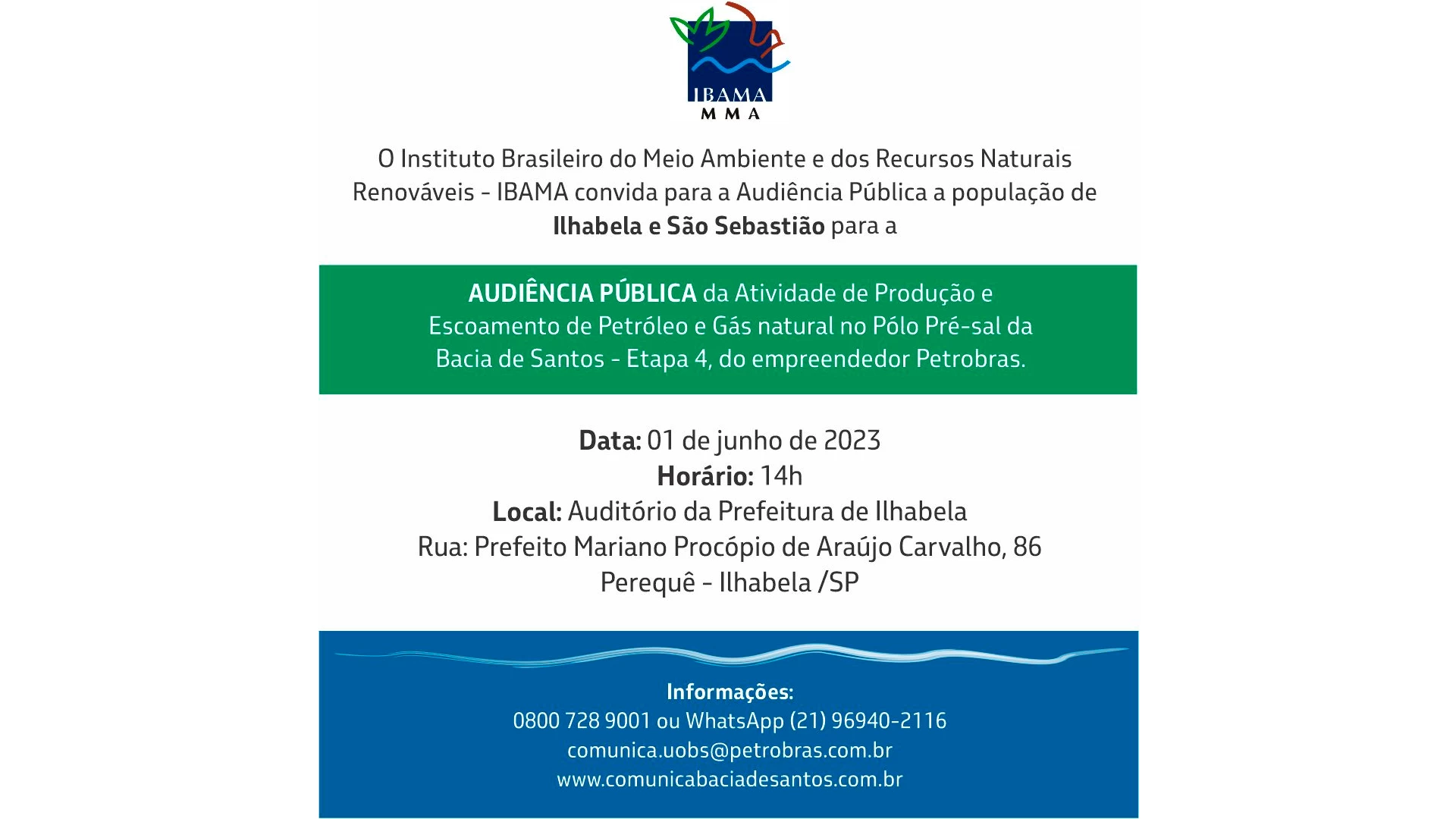 A Prefeitura de Ilhabela recebe no próximo dia 1º de junho às 14h a audiência pública promovida pelo Instituto Brasileiro do Meio Ambiente e dos Recursos Naturais Renováveis – IBAMA sobre o projeto Etapa 4 da Petrobras, para detalhar atividades de produção e escoamento de gás no pré-sal da Bacia de Santos. O encontro é direcionado a moradores de Ilhabela e também São Sebastião e será realizado no auditório Pasquale Colucci, no Paço Municipal.