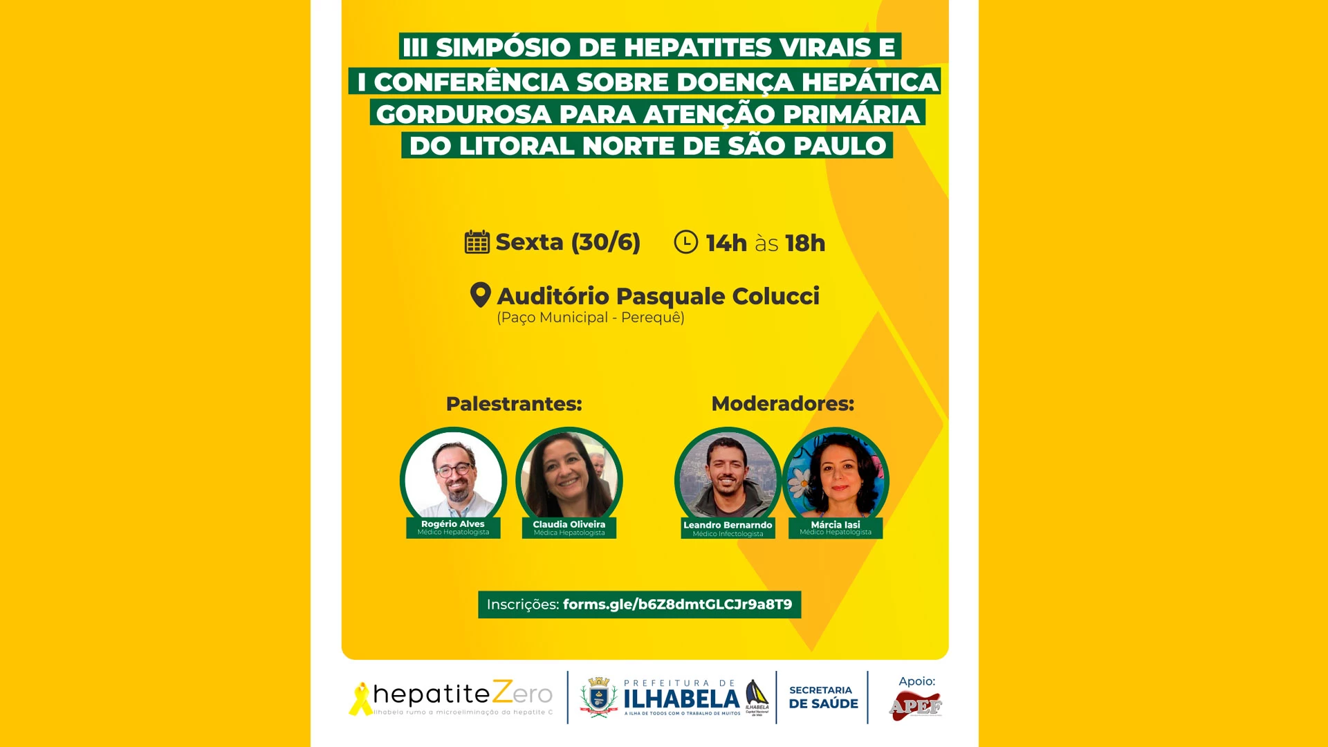 A Prefeitura de Ilhabela, em parceria com a Associação Paulista para o Estudo do Fígado (APEF), realiza no dia 30 de junho, no auditório do Paço Municipal, o III Simpósio de Hepatites Virais e a I Conferência de Saúde sobre Doença Hepática Gordurosa para a Atenção Primária do Litoral Norte de São Paulo.