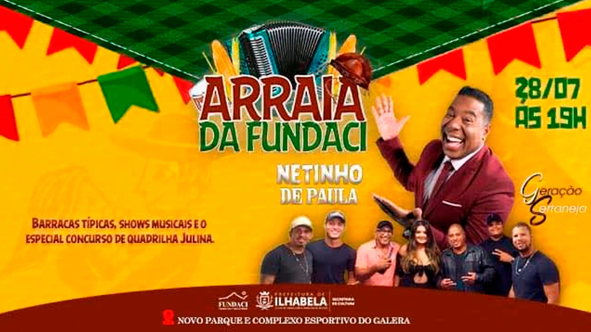 A Prefeitura de Ilhabela e a Fundação Arte e Cultura de Ilhabela (Fundaci) promovem o inédito "Concurso de Quadrilha Julina" como parte da programação do Arraiá da Fundaci. O evento será realizado nos dias 28 e 29 de julho, a partir das 19h, no Novo Parque do Galera - Água Branca.