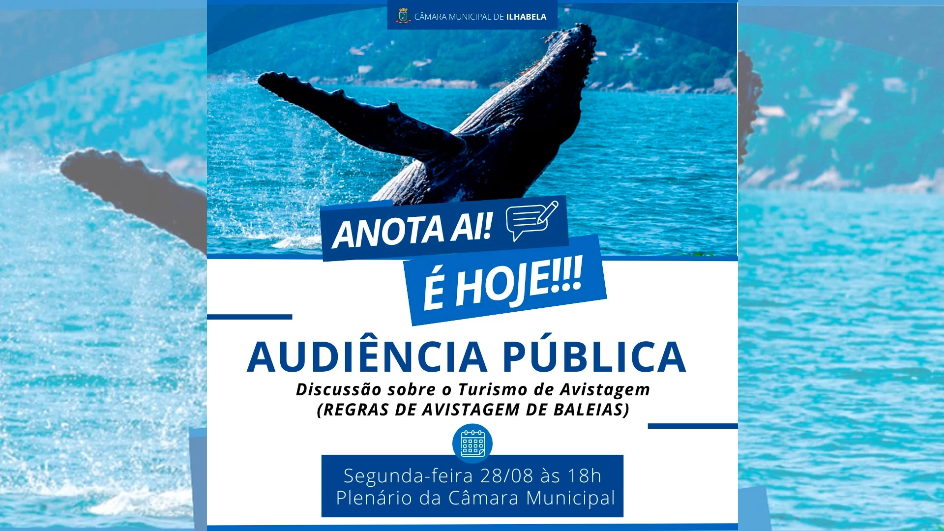 Câmara de Ilhabela realiza, HOJE, segunda-feira (28/08), às 18 horas, Audiência Pública para discutir e regulamentar o turismo de avistagem (tratar sobre regras de avistagem de baleias).