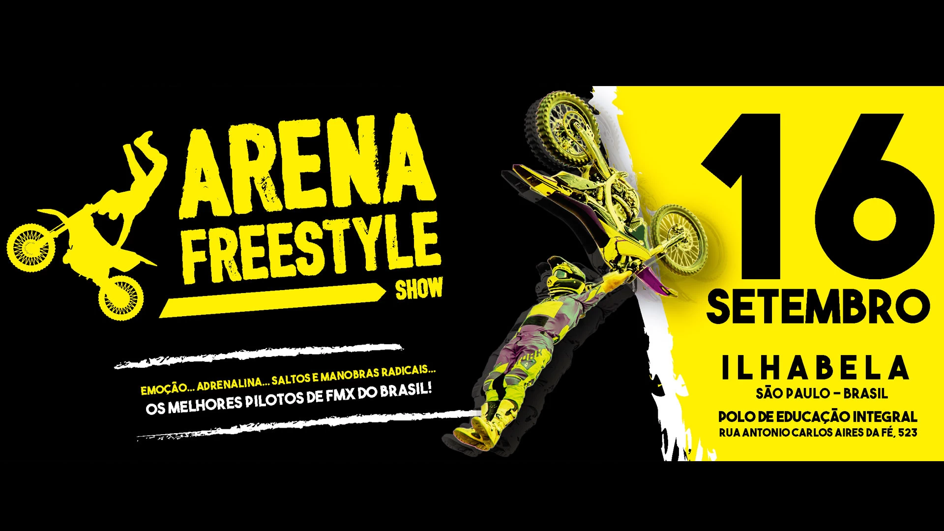 A Prefeitura de Ilhabela tem o prazer de anunciar a realização da segunda etapa do Arena Freestyle Show 2023, marcada para o próximo sábado, dia 16 de setembro, no Campo do PEII, na Barra Velha. Os pilotos prometem uma disputa de alto nível e um grande show para o público presente. A prova é parte integrante do Campeonato Brasileiro de Freestyle Motocross (FMX) e a programação tem início às 19h.