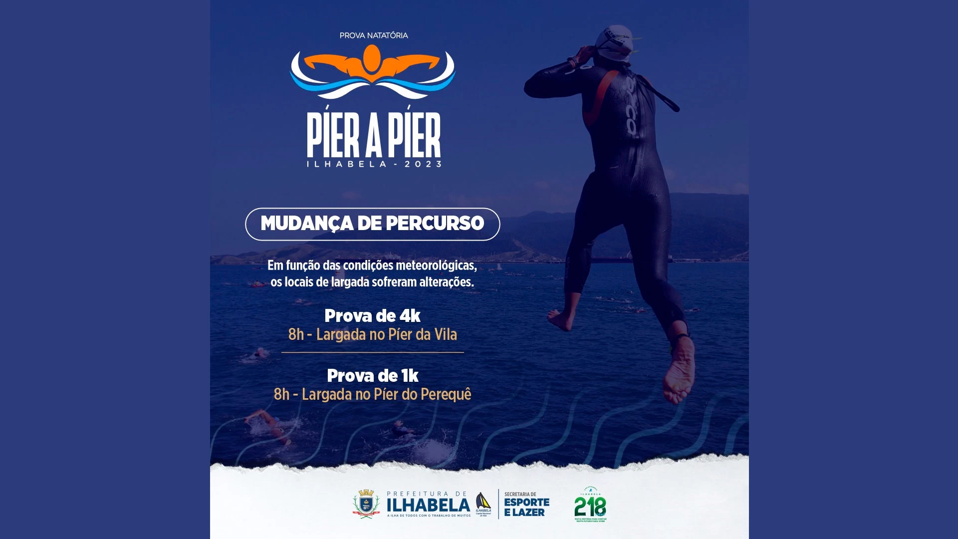 A Prefeitura de Ilhabela informa que o percurso da Prova Natatória Píer a Píer 2023 foi alterado em função das condições climáticas. A largada dos 4k será no Píer da Vila com chegada no Píer do Perequê. Já a prova de 1k terá a sua largada e chegada no Píer do Perequê. Ambas as largadas estão marcadas para às 8h.