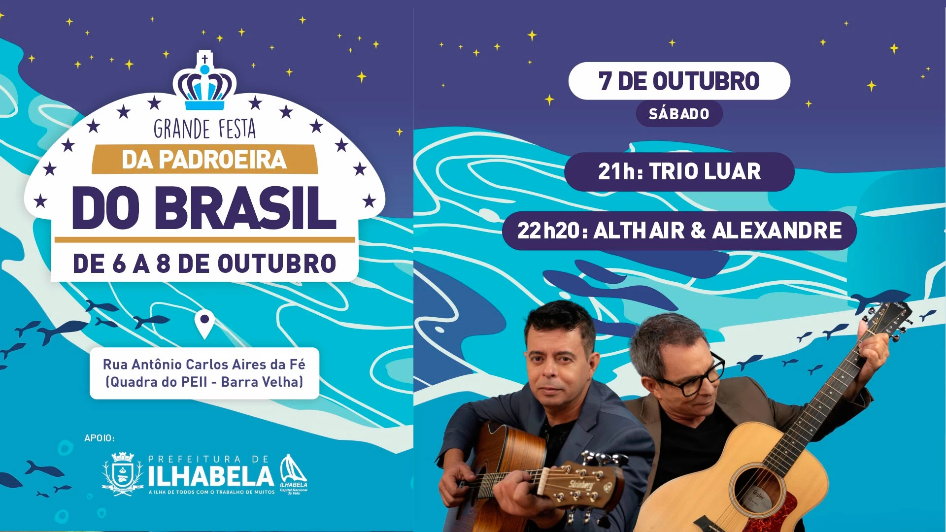 Ilhabela recebe as comemorações sociais da Festa da Padroeira do Brasil neste fim de semana (6 a 8/10). Barracas típicas, sorteio de prêmios e atrações musicais com destaque para shows com o grupo Originais do Samba e a dupla Althair & Alexandre integram a programação que começa sempre a partir das 20h na quadra do PEII – Barra Velha.