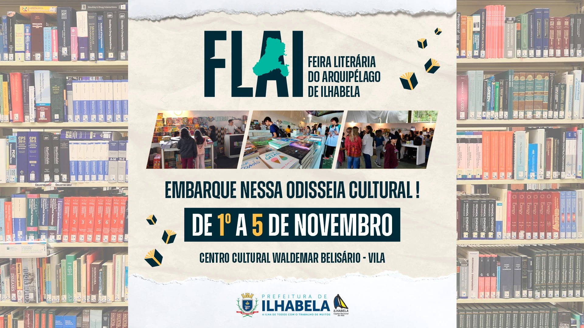 A Prefeitura de Ilhabela, por meio da Secretaria de Cultura, divulga a programação da Feira Literária de Ilhabela (FLAI), que ocorre a partir da próxima quarta-feira (1) e prossegue até domingo (5), no Centro Cultural Waldemar Belisário – Vila. O evento vai contar com lançamentos de livros, contação de histórias, oficinas, palestras, rodas de conversa, teatro e concurso de poesia.