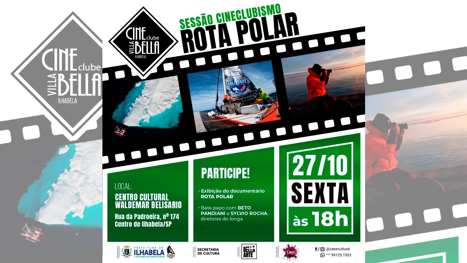 O Cine Villa Bella, em parceria com a Secretaria de Cultura de Ilhabela, exibe a o documentário "Rota Polar" nos dias 27 (sexta-feira) e 28 (sábado) de outubro, às 18h e às 19h respectivamente. O evento faz parte do Cineclubismo, uma iniciativa que busca promover o estudo e a análise do conteúdo exibido, além de oferecer espaço para mesas de discussão, rodas de conversa, palestras e muito mais.