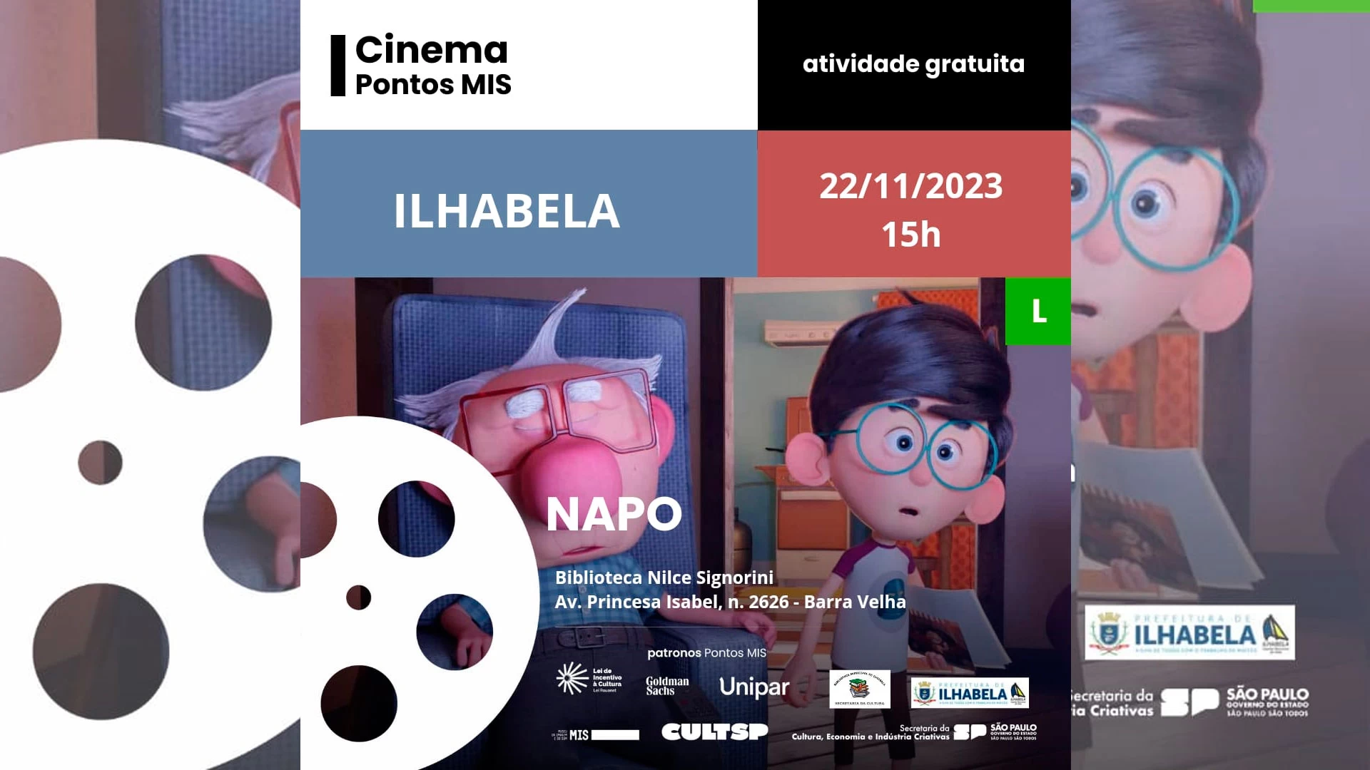 O Cinema Pontos MIS de Ilhabela divulgou a programação do mês de novembro, que tem início nesta quarta-feira (22), na Biblioteca Videoteca da Barra Velha, que fica na avenida Princesa Isabel, 2626.