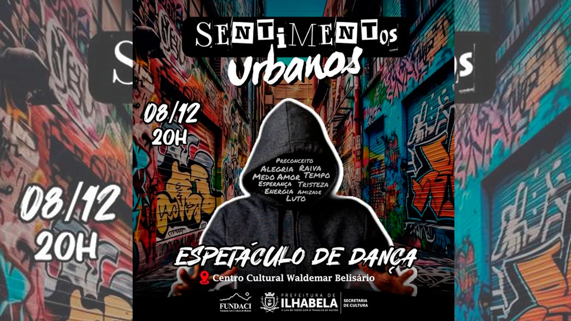 A Fundação Arte e Cultura de Ilhabela (Fundaci) apresenta nesta sexta-feira (8), às 8h, no Centro Cultural Waldemar Belizário, na Vila (Centro Histórico), o espetáculo de dança “Sentimentos Urbanos”, com direção de Marcos Miranda (Quinho). A apresentação tem como proposta levar ao palco toda a expressão emocional representada pela arte dos dançarinos.