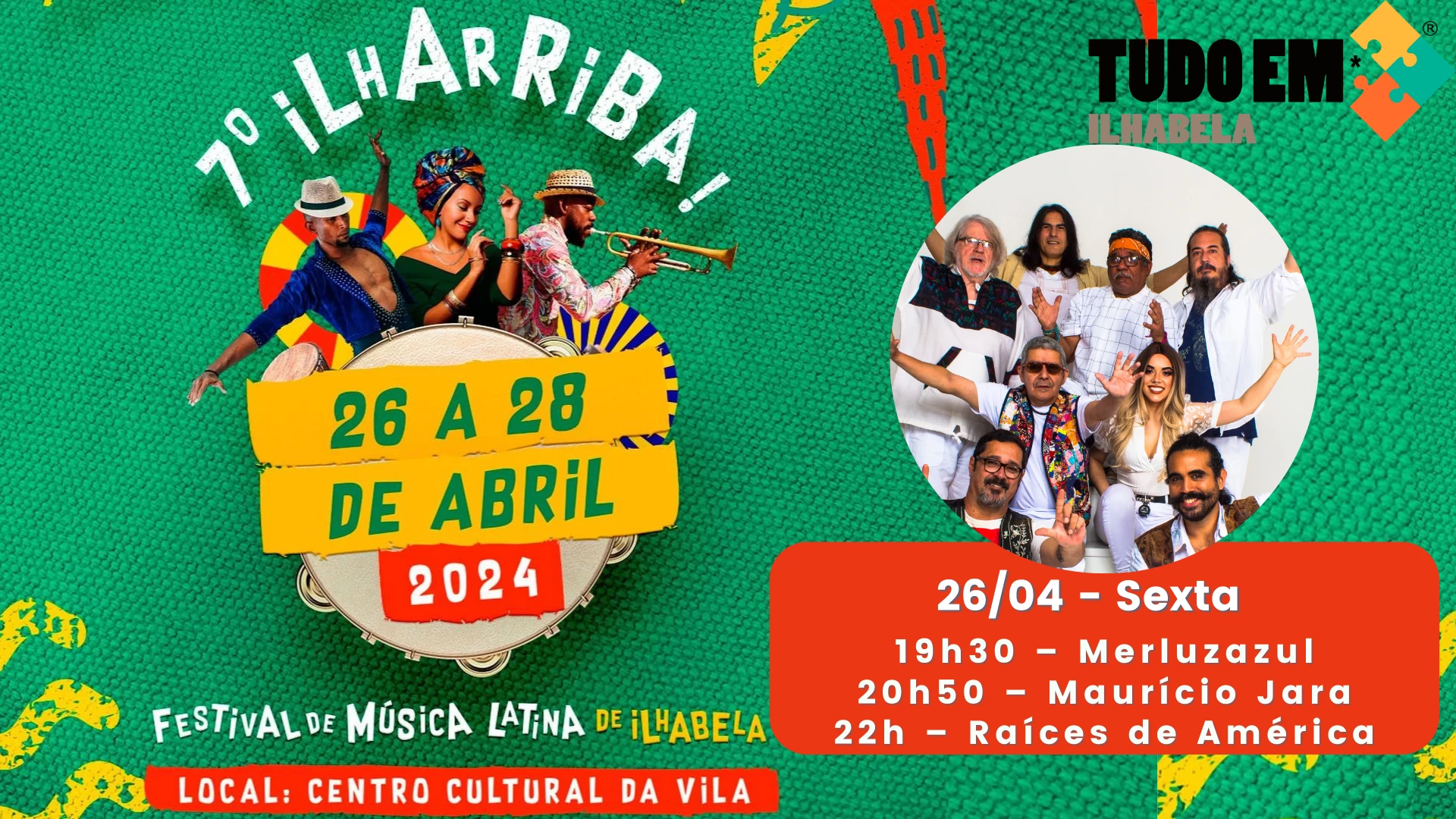 O Centro Cultural da Vila recebe nos dias 26, 27 e 28 de abril a 7ª edição do Ilharriba, um festival que promete agitar o público com diversas músicas latinas. As apresentações iniciam a partir das 19h30.