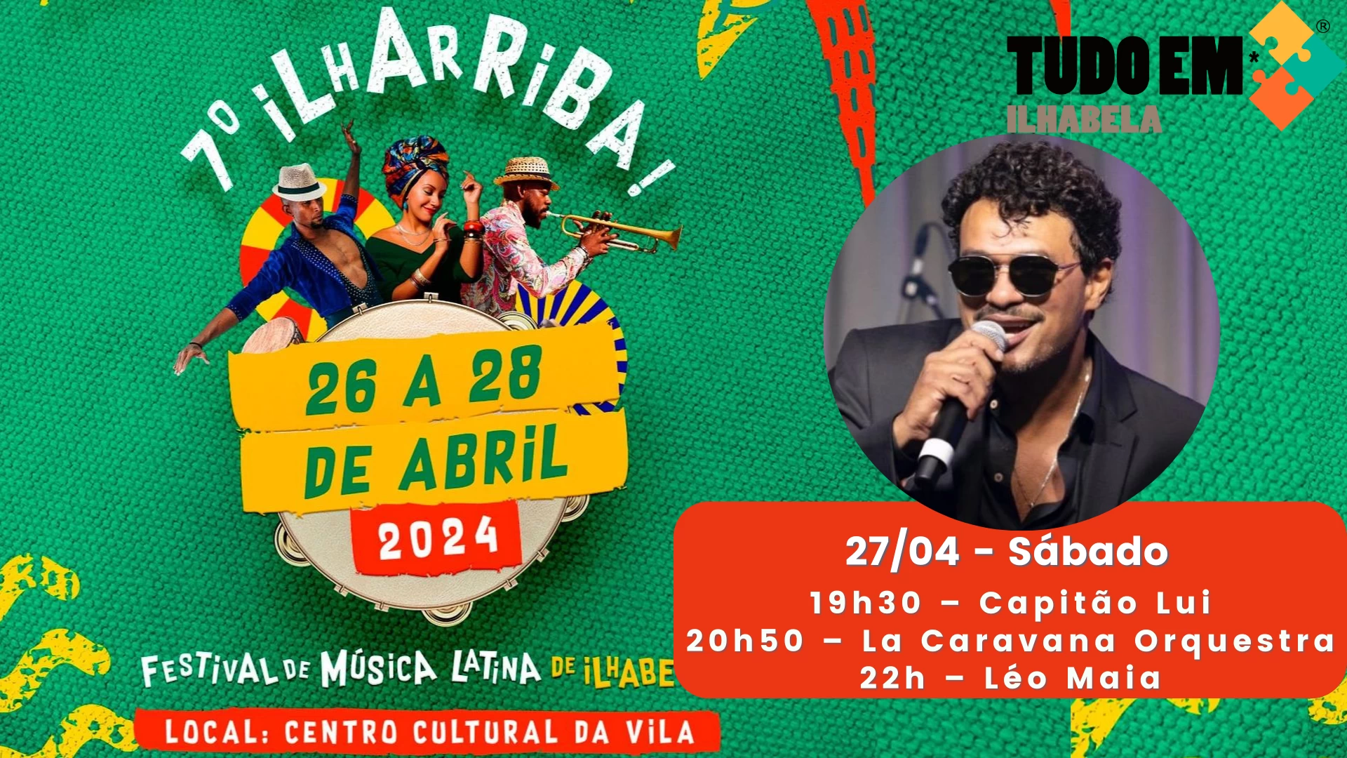 O Centro Cultural da Vila recebe nos dias 26, 27 e 28 de abril a 7ª edição do Ilharriba, um festival que promete agitar o público com diversas músicas latinas. As apresentações iniciam a partir das 19h30.