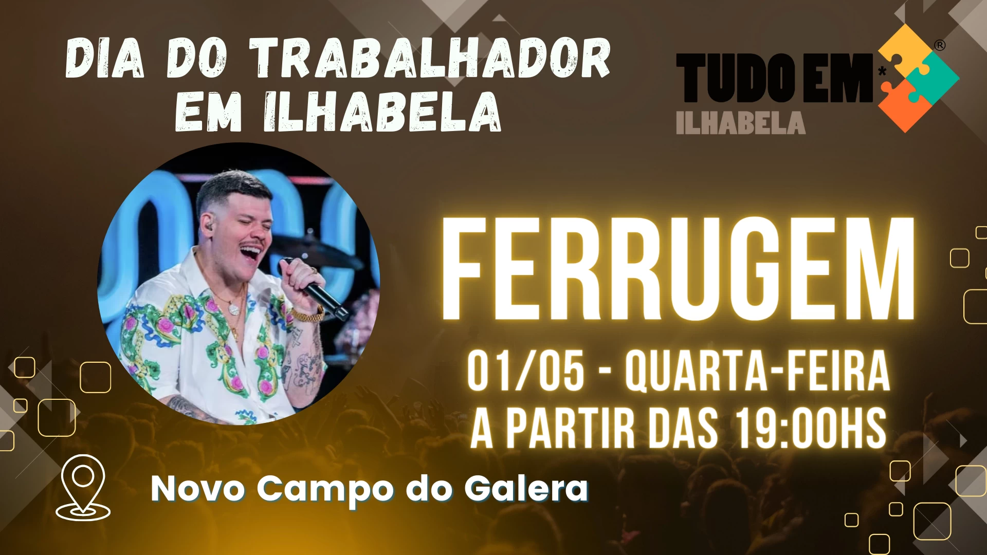No Dia do Trabalhador (1º), o cantor e compositor Ferrugem se apresenta no Novo Galera, cantando seus principais sucessos. Jheison Failde de Souza, conhecido como Ferrugem, é destaque no cenário musical brasileiro como um dos principais representantes do pagode.