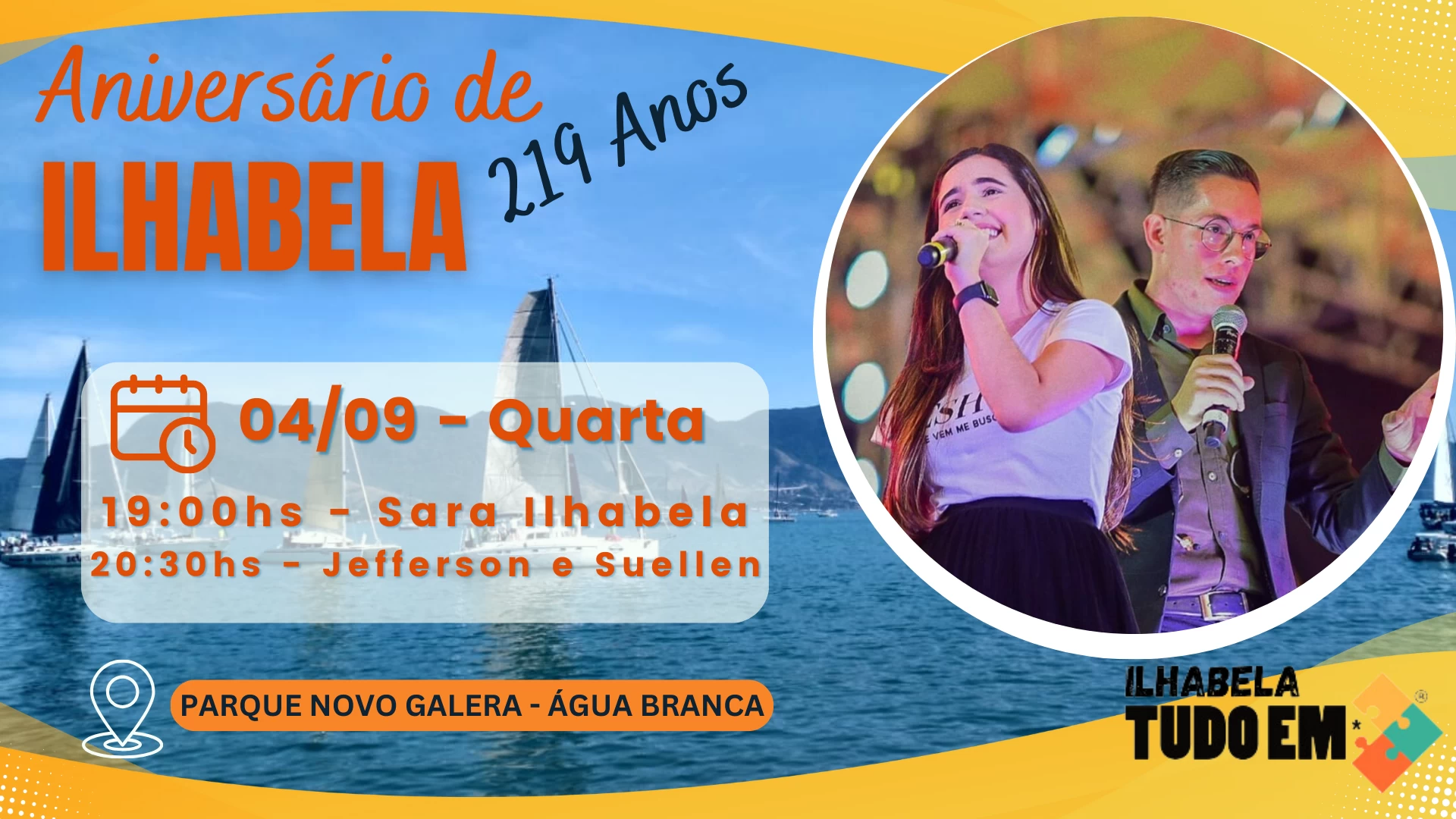 A Prefeitura de Ilhabela anunciou a aguardada programação dos shows que prometem agitar moradores e turistas entre os dias 30 de agosto e 6 de setembro, no Parque Novo Galera, em comemoração aos 219 anos da cidade. Este ano, a festa será marcada por uma diversidade musical que inclui, além das bandas locais, muito pop, sertanejo, pagode e até do hip hop.