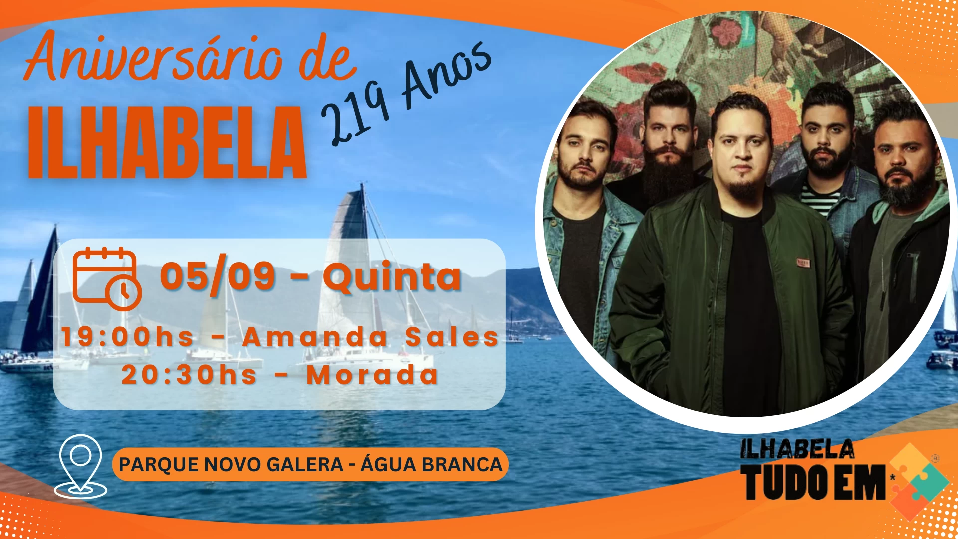 A Prefeitura de Ilhabela anunciou a aguardada programação dos shows que prometem agitar moradores e turistas entre os dias 30 de agosto e 6 de setembro, no Parque Novo Galera, em comemoração aos 219 anos da cidade. Este ano, a festa será marcada por uma diversidade musical que inclui, além das bandas locais, muito pop, sertanejo, pagode e até do hip hop.