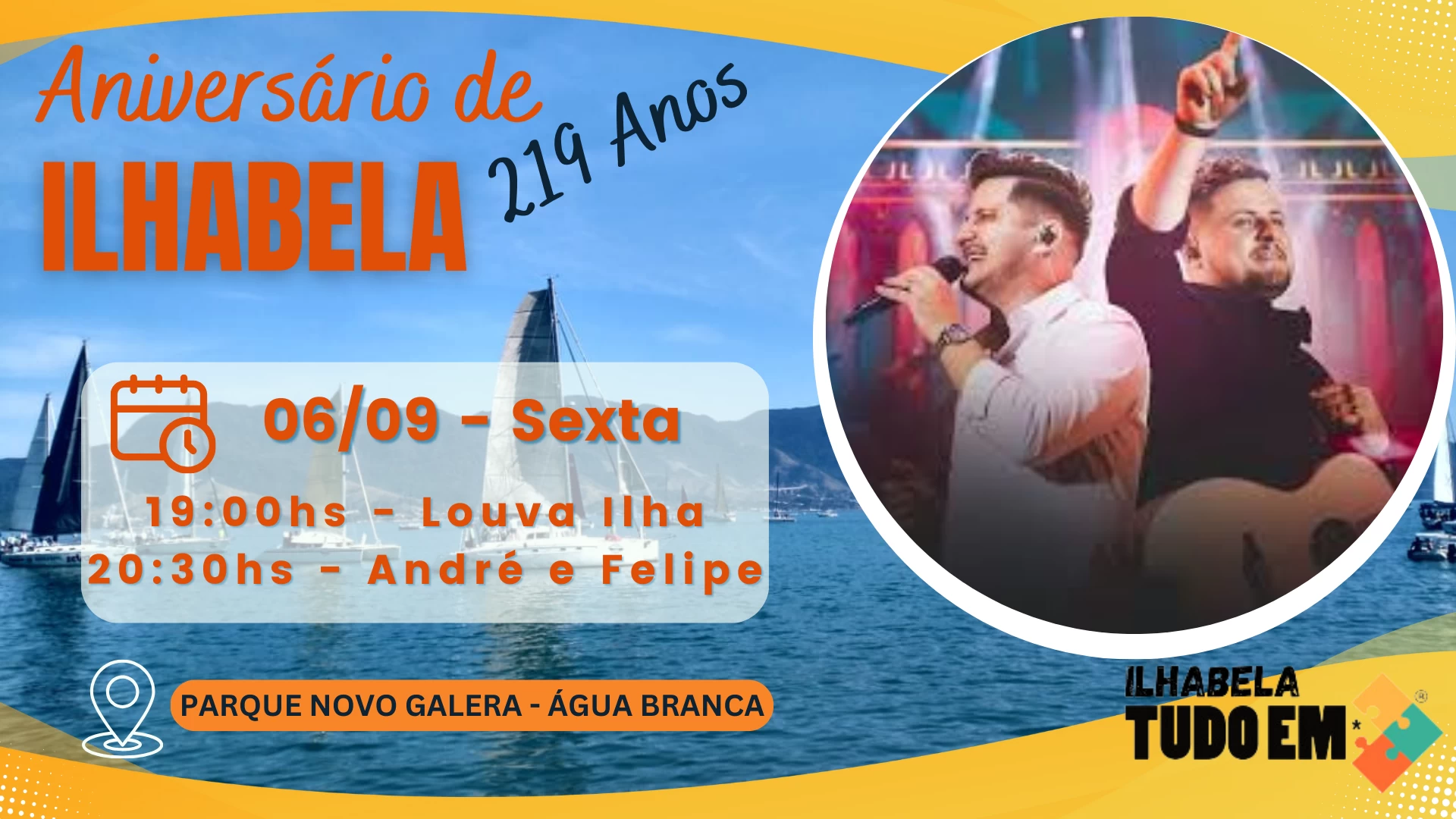 A Prefeitura de Ilhabela anunciou a aguardada programação dos shows que prometem agitar moradores e turistas entre os dias 30 de agosto e 6 de setembro, no Parque Novo Galera, em comemoração aos 219 anos da cidade. Este ano, a festa será marcada por uma diversidade musical que inclui, além das bandas locais, muito pop, sertanejo, pagode e até do hip hop.