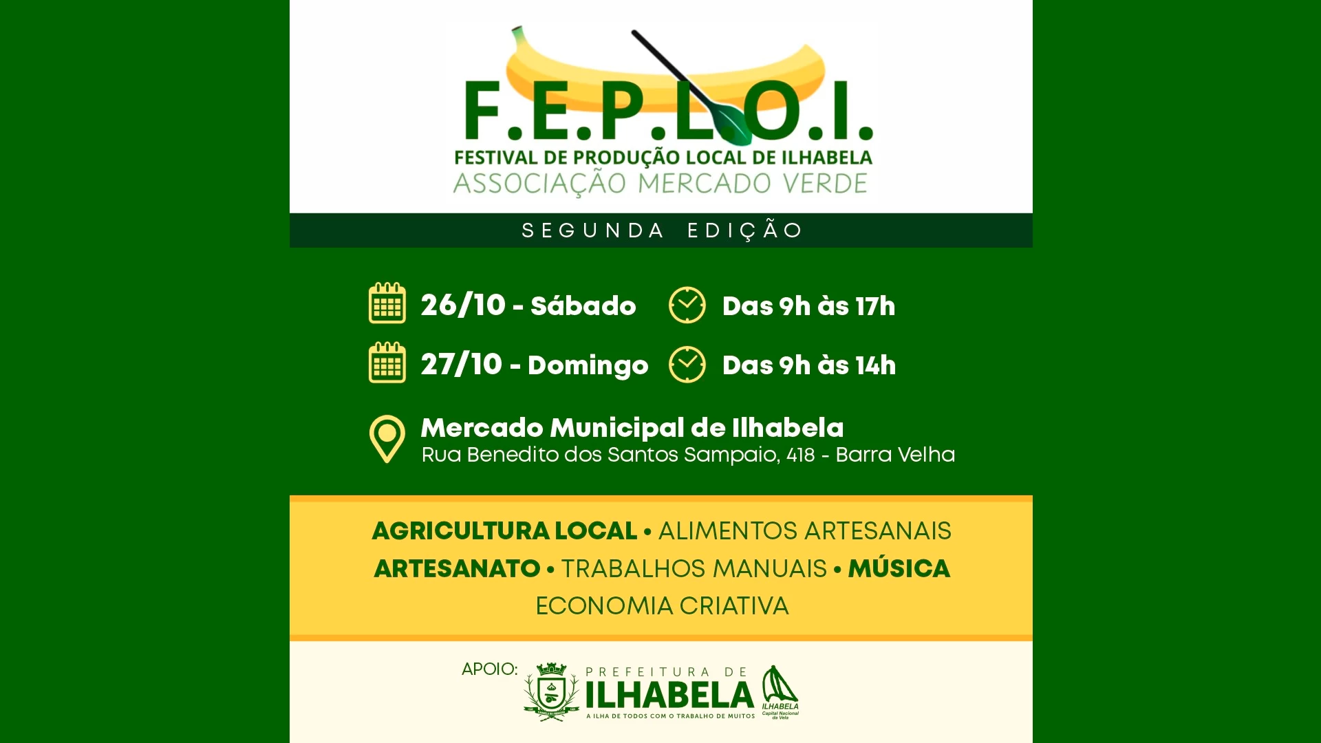 A 2ª edição do Festival de Produção Local de Ilhabela (F.E.P.L.O.I.), promovido pela Associação Mercado Verde em parceria com a Prefeitura de Ilhabela, será realizado neste sábado e domingo (26 e 27/10), no espaço externo do Mercado Municipal de Ilhabela. O evento reunirá cerca de 20 comerciantes, incluindo artesãos, produtores de arranjos florais, alimentos e outros produtos da região.
