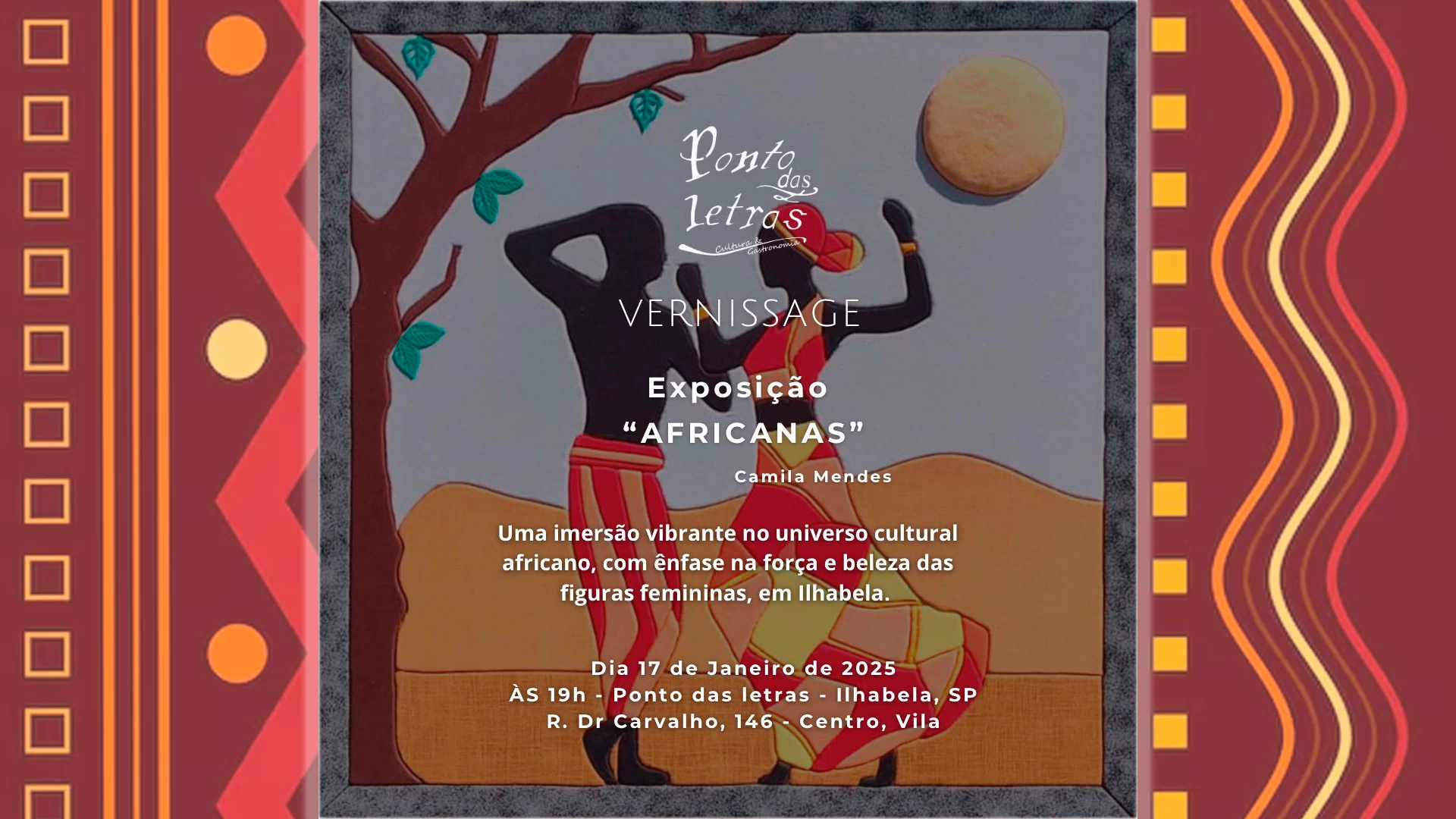 É com muita alegria que convido vocês para a minha exposição "Africanas", que será inaugurada nesta sexta-feira, dia 17 de janeiro, às 19h, no Ponto das Letras, em Ilhabela.