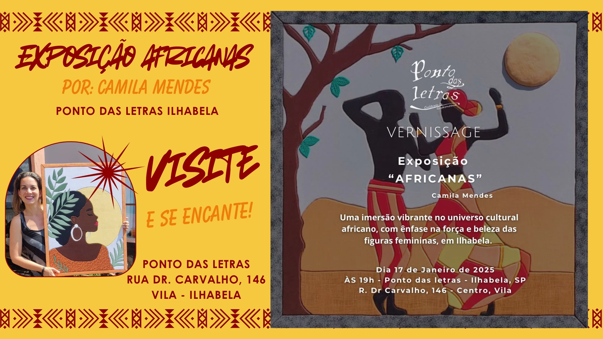 A artista Camila Mendes apresenta sua 4ª exposição individual, "Africanas", uma imersão vibrante no universo cultural africano, com ênfase na força e beleza das figuras femininas, em Ilhabela. A exposição ficará em cartaz até 6 de março de 2025, no Ponto das Letras em Ilhabela.