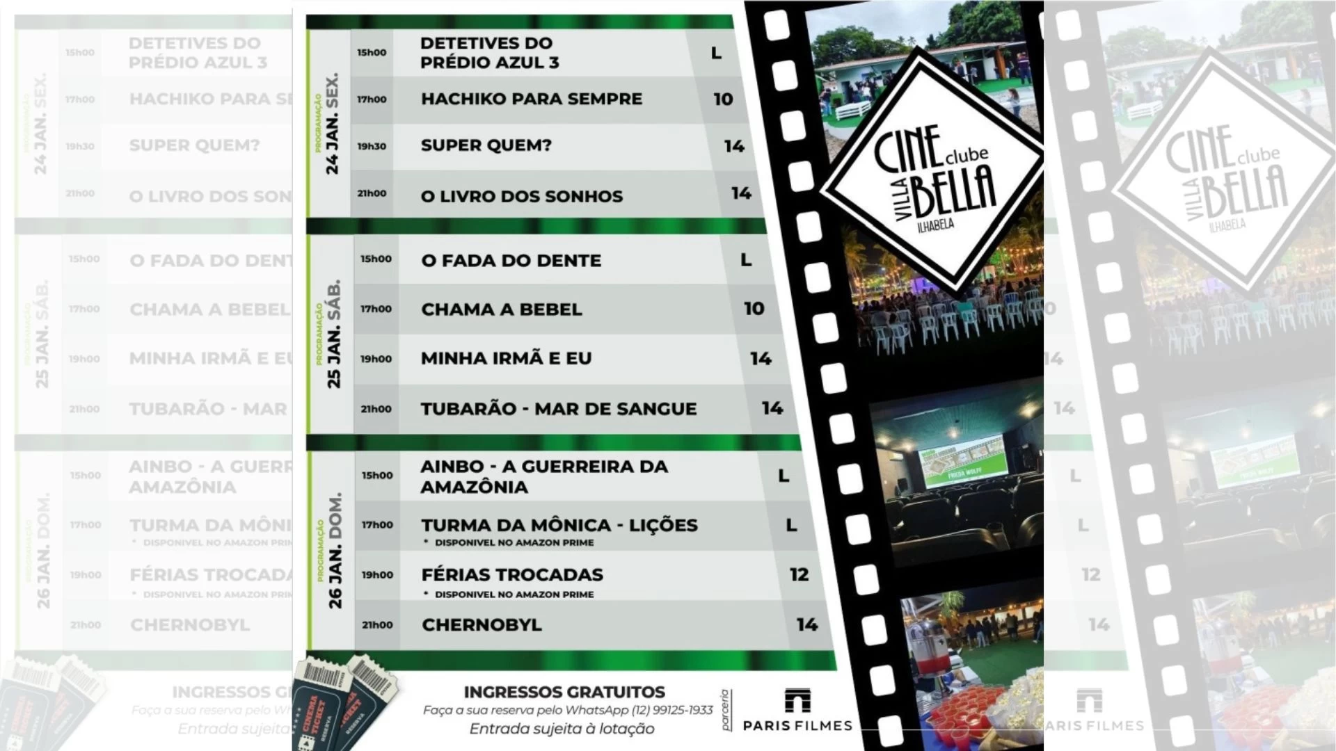 O Cine Villa Bella & Clube de Ilhabela divulgou, nesta quinta-feira (23), a programação deste fim de semana com filmes de diferentes gêneros e com classificações para todas as idades.