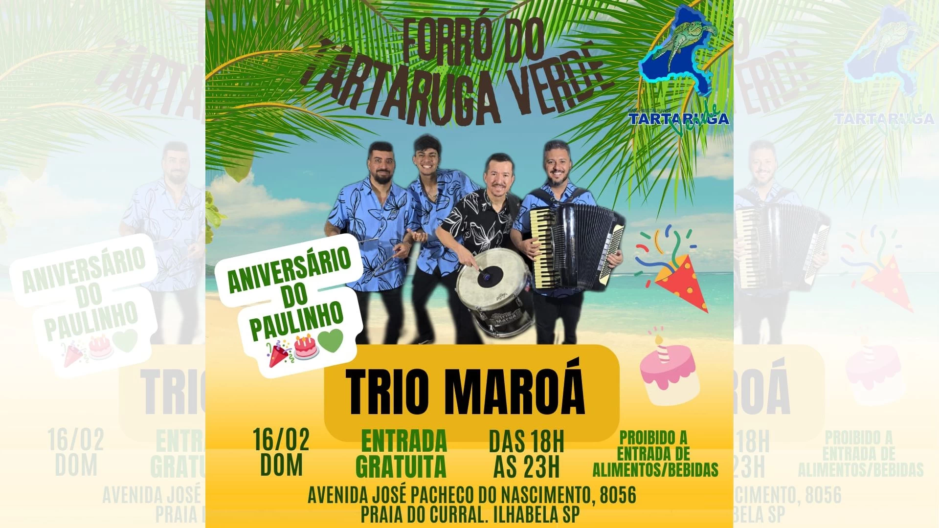 Esse domingo o forró estará mais que especial! É o aniversário do Paulinho do Trio Maroá, então já sabe que vai ser daquele jeito que a gente gosta!! Só vem, dia 16/02, das 18h as 23h que a entrada é gratuita a noite toda!!