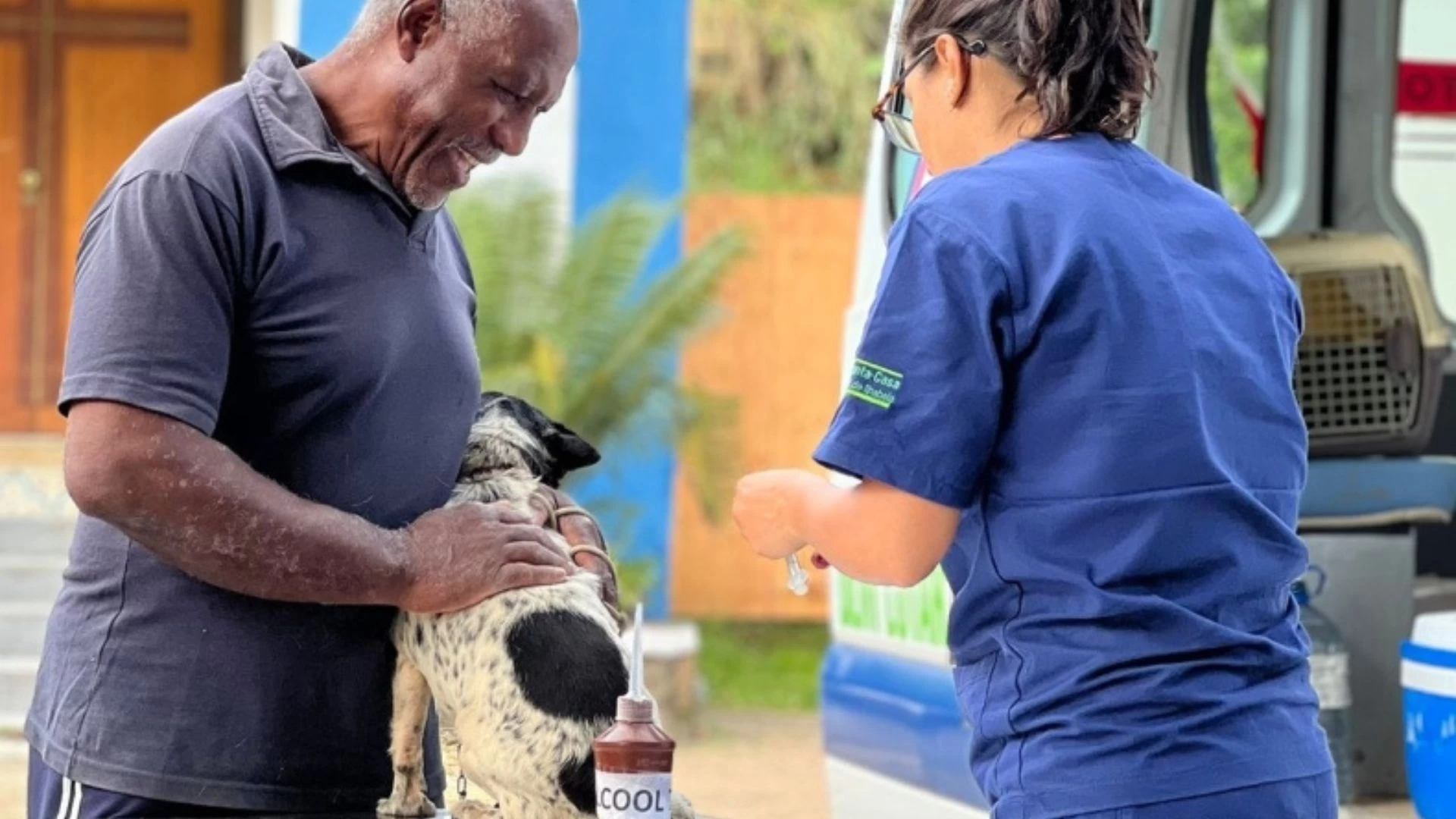 Durante as ações, uma equipe completa — formada por médicos veterinários, motorista, auxiliar de tratador e administrativo — realiza atendimentos com consultas, vacinação, vermifugação, microchipagem e agendamento de castração de cães e gatos.