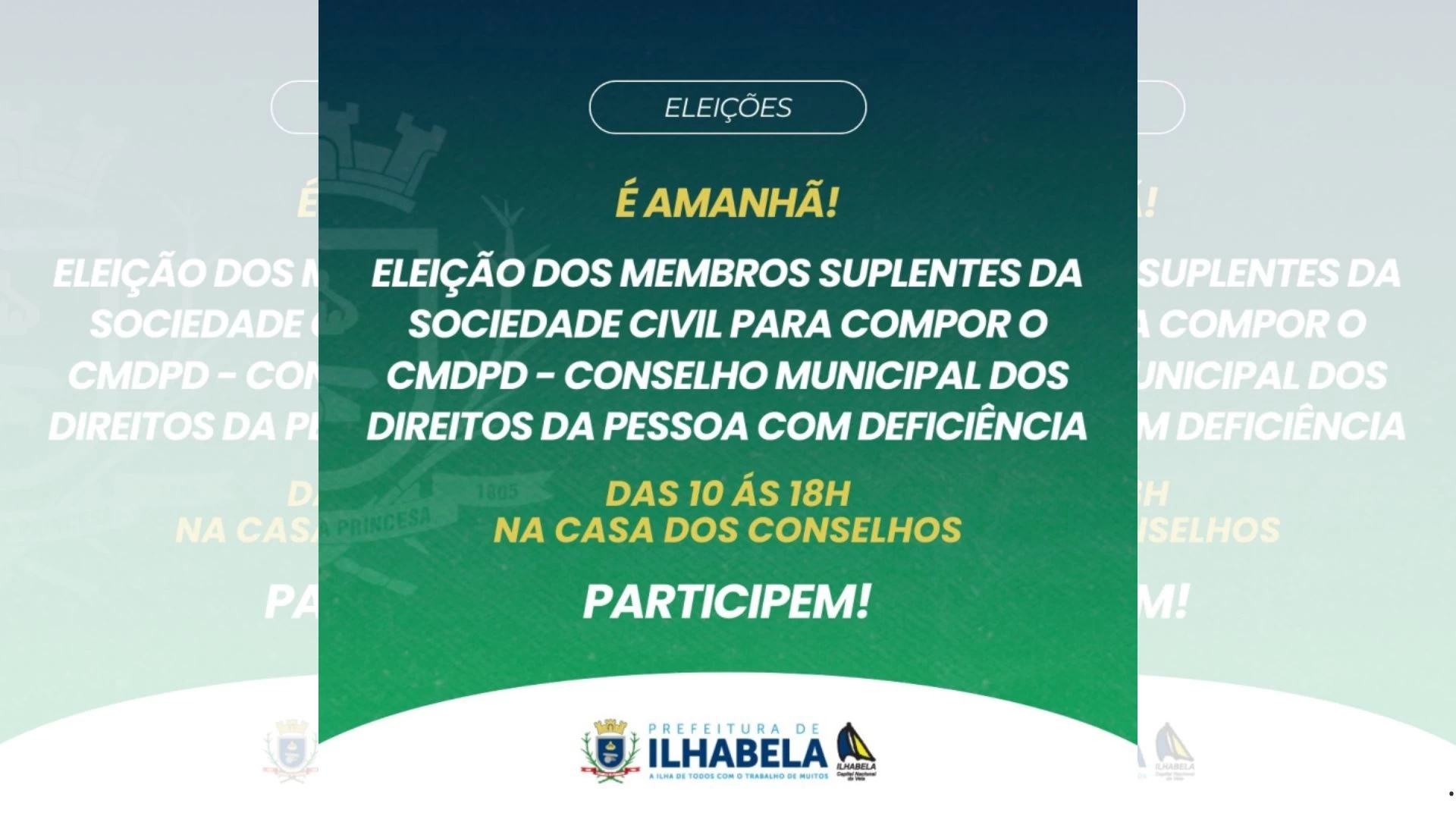 O Conselho Municipal dos Direitos da Pessoa com Deficiência (CMDPD) de Ilhabela realiza, nesta quarta-feira (16), eleições para representantes suplentes de membros da sociedade civil. A votação ocorre das 10h às 18h na Casa dos Conselhos, localizada no prédio do Centro de Informações Turísticas (CIT), na Praça Vereador José Leite dos Passos, nº 14, Barra Velha.