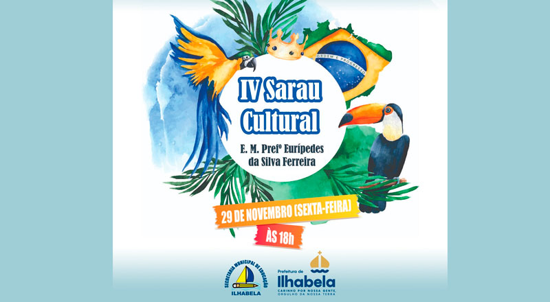 A Prefeitura de Ilhabela, por meio da Secretaria de Educação, irá realizar na E.M. Prefeito Eurípedes da Silva Ferreira, apresenta o IV Sarau Cultural com o tema “Brasil: Aquarela de Culturas”, nesta sexta-feira (29), às 18h, integrando o calendário escolar da instituição buscando uma reflexão crítica e social sobre as diferentes culturas do Brasil.