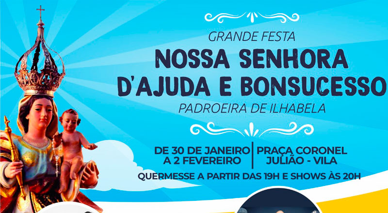 A Prefeitura de Ilhabela, por meio da Secretaria de Cultura e a Fundaci (Fundação Arte e Cultura de Ilhabela), abre a festa social de Nossa Senhora da Ajuda e Bonsucesso, a padroeira da cidade, com show da Banda 14 Bis. As novenas tiveram início na última semana e a festa social se inicia nesta quinta-feira (30), e seguem até o dia 2 de fevereiro, na praça Coronel Julião, na Vila – Centro Histórico.