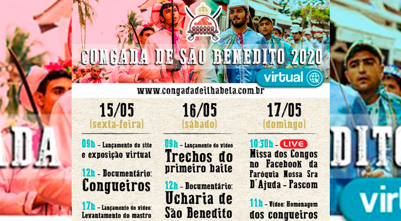 A programação virtual inclui vídeos com depoimentos de congueiros, exposição virtual e live da missa dos Congos