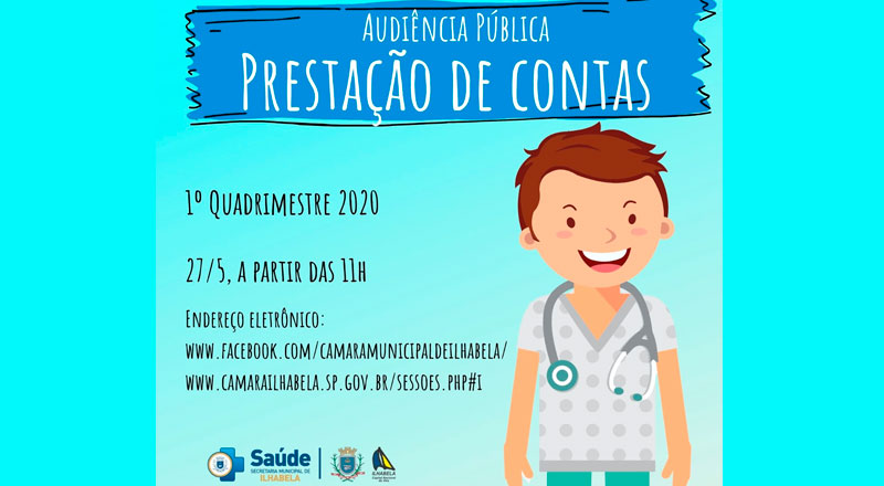 A Secretaria de Saúde de Ilhabela realizará na quarta-feira (27), a partir das 11h, na Câmara Municipal, a prestação de contas referente ao primeiro quadrimestre de 2020.
