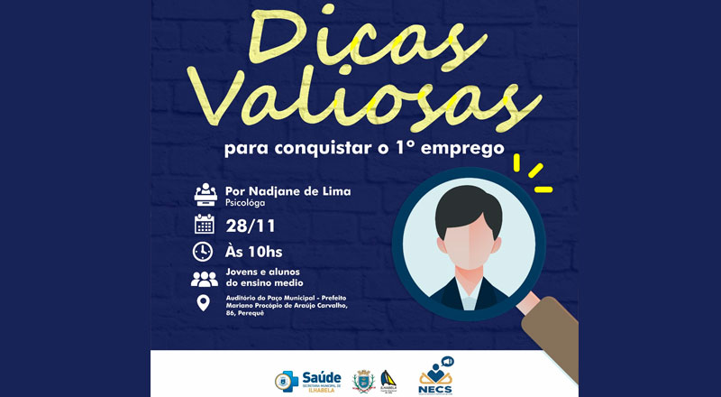 O mundo globalizado está exigindo que cada vez mais cedo os jovens façam sua opção profissional e por conta do período pandêmico, as dificuldades que os jovens estão encontrando para conseguir o primeiro emprego, tem chamado a atenção da Prefeitura de Ilhabela, que por meio da Secretaria de Saúde, irá realizar na sexta-feira (28), uma palestra com dicas e estratégias que visam auxiliar na busca do primeiro emprego.