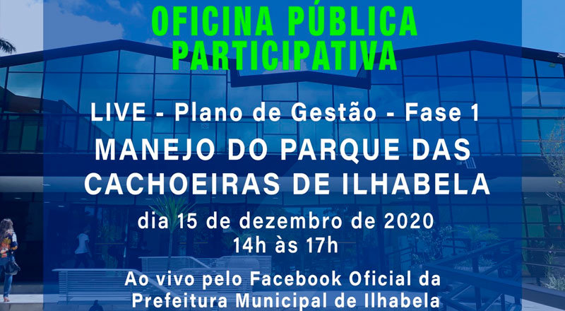 A Prefeitura de Ilhabela, por meio da Secretaria de Meio Ambiente, realizará nesta terça-feira (15), às 14h e 17h, em sua página oficial do Facebook, a Oficina Pública Participativa online, através de live para tratar sobre o Plano de Gestão – Fase 1 – Manejo do Parque das Cachoeiras de Ilhabela.