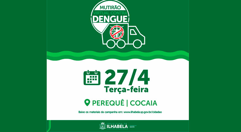A campanha de conscientização e de eliminação de criadouros do mosquito da dengue continua em Ilhabela. Desta vez, a ação ocorre nesta terça-feira (27/04) nos bairros do Perequê e Cocaia.