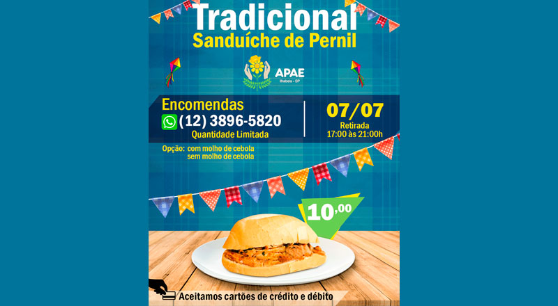 Não tem festa, mas tem sanduíche! Não deixe de saborear o tradicional sanduíche de pernil da Associação de Pais e Amigos dos Excepcionais (Apae) de Ilhabela, nesta quarta-feira (7), das 17h às 21h, na sede da instituição.