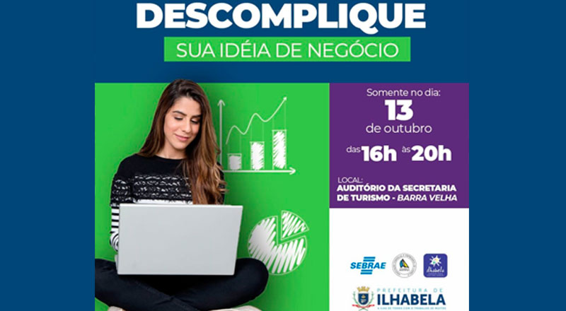 O Posto do Sebrae Aqui de Ilhabela oferecerá no dia 13 de outubro, das 16h às 20h, no auditório da Secretaria de Turismo (rotatória do mapa), o curso Descomplique: sua ideia de negócios. Para participar é necessário fazer a inscrição pelo link: https://bit.ly/SuaIdeiadeNegocio.