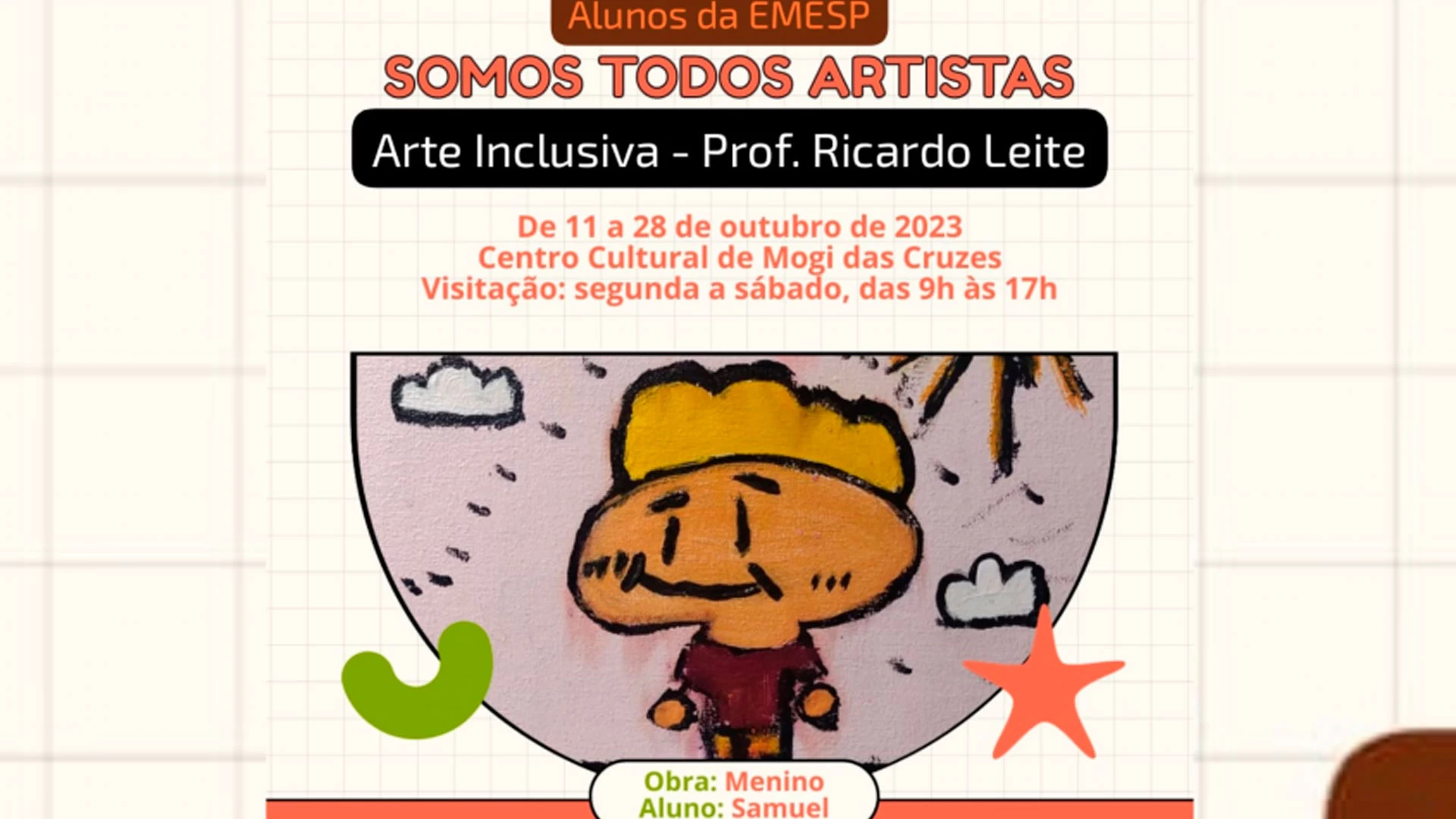 A partir desta quarta-feira (11/10), trabalhos produzidos pelo coletivo de alunos-artistas da Escola Municipal de Educação Especial (Emesp) Profª Jovita Franco Arouche, na Vila Lavínia, poderão ser vistos na exposição “Somos todos Artistas – Arte Inclusiva”, que estará em cartaz no Centro Cultural de Mogi das Cruzes, no Centro, até o dia 28. As obras foram produzidas com mediação do professor Ricardo Leite, que leciona Artes na unidade escolar.