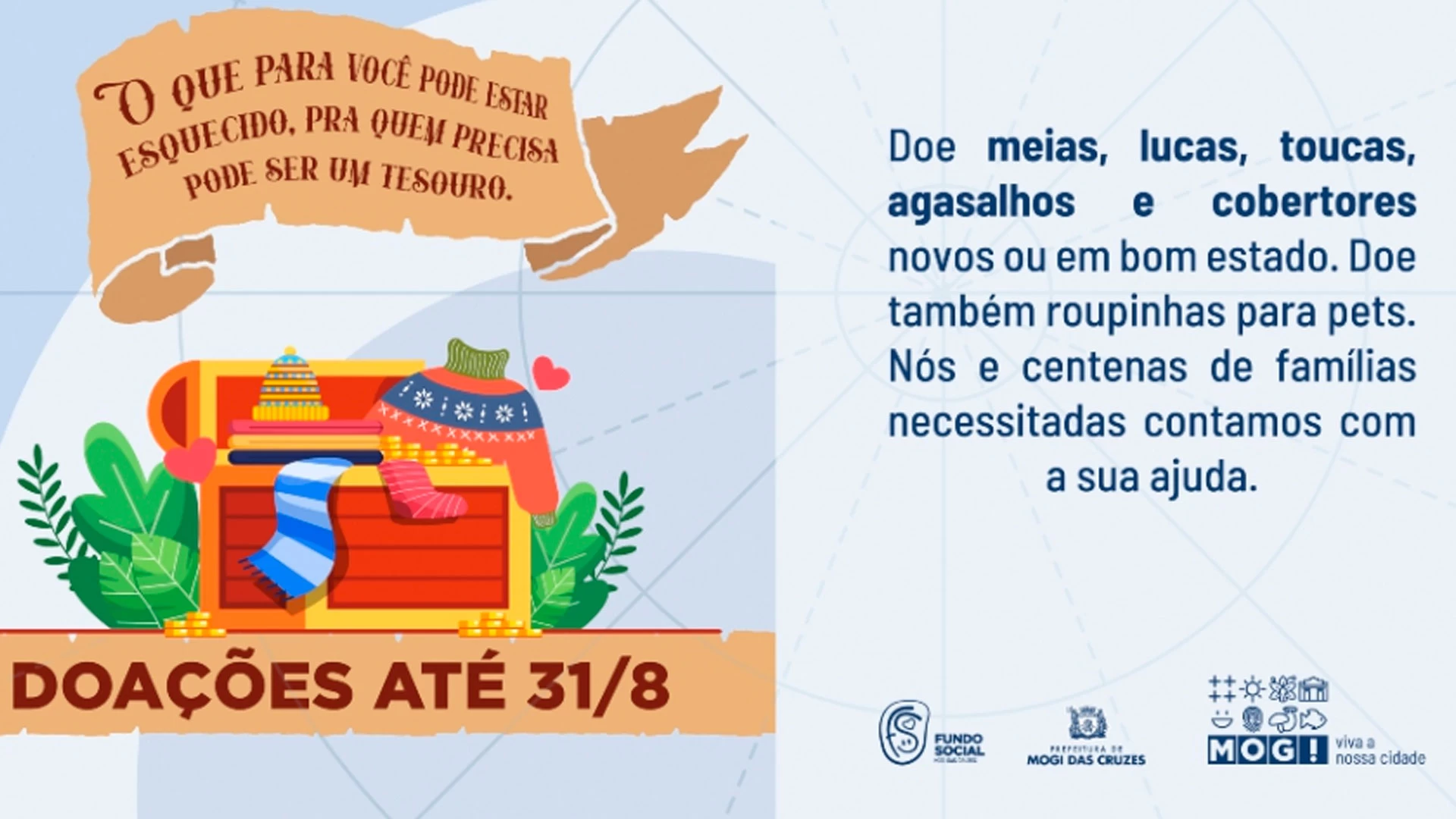 Realizada anualmente pelo Fundo Social, a campanha Inverno Solidário incentiva a doação de roupas, agasalhos e cobertores, além de roupinhas, mantas e outras peças para pets. O objetivo é atender as pessoas de regiões de vulnerabilidade durante os meses de outono e inverno, quando as temperaturas caem.