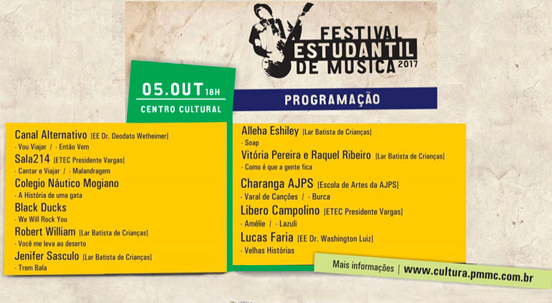 O FEEM chega neste ano a sua 3ª edição consecutiva. Nele, podem se inscrever artistas solos, duplas, trios e ou grupos que sejam formados por alunos matriculados nas unidades escolares públicas ou particulares, de ensino médio e/ou fundamental, situadas na cidade de Mogi das Cruzes. Podem participar também alunos de escolas de música, desde que matriculados em alguma instituição de ensino do município. A idade máxima permitida aos concorrentes é de 20 anos.