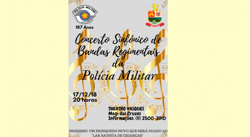 Concerto Sinfônico de Bandas Regimentais: da Polícia Militar Dia 17 de dezembro às 20h no Theatro Vasques. Data: 17 de Dezembro de 2018 Horário: 20:00.