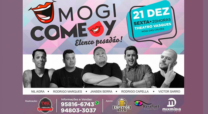 Mogi Comedy: 21 de Dezembro às 20h no Theatro Vaques. Data: 21 de Dezembro de 2018 Horário: 20:00 Local: Theatro Vasques Endereço: Rua Doutor Corrêa 515.
