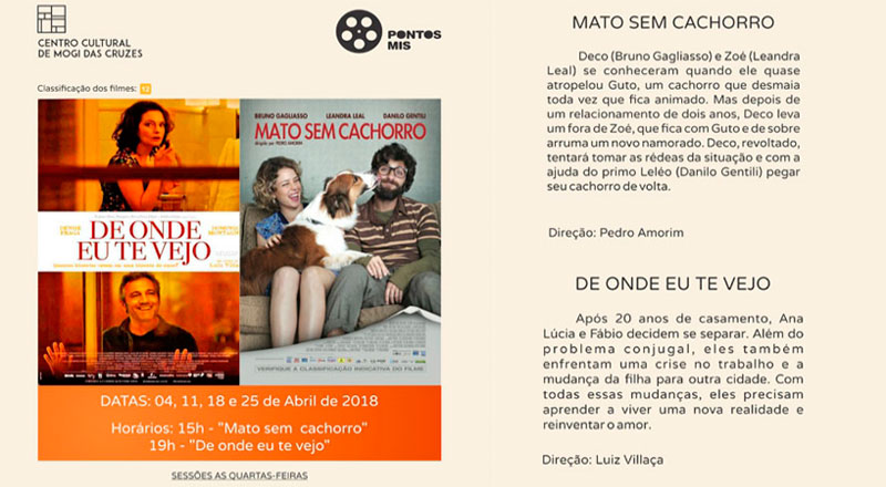 Cinema Pontos MIS - Exibição de filme: Cinema Pontos MIS - Filmes "De Onde eu Te Vejo" e "Mato Sem Cachorro" Exibição dos Filmes: Mato Sem Cachorro -.